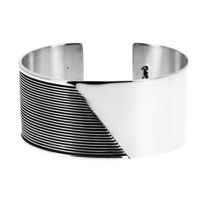 Magnifique bracelet manchette en argent lisse et oxydé sur moitié du bracelet sous forme de lignes. Une très belle pièce de notre collection !